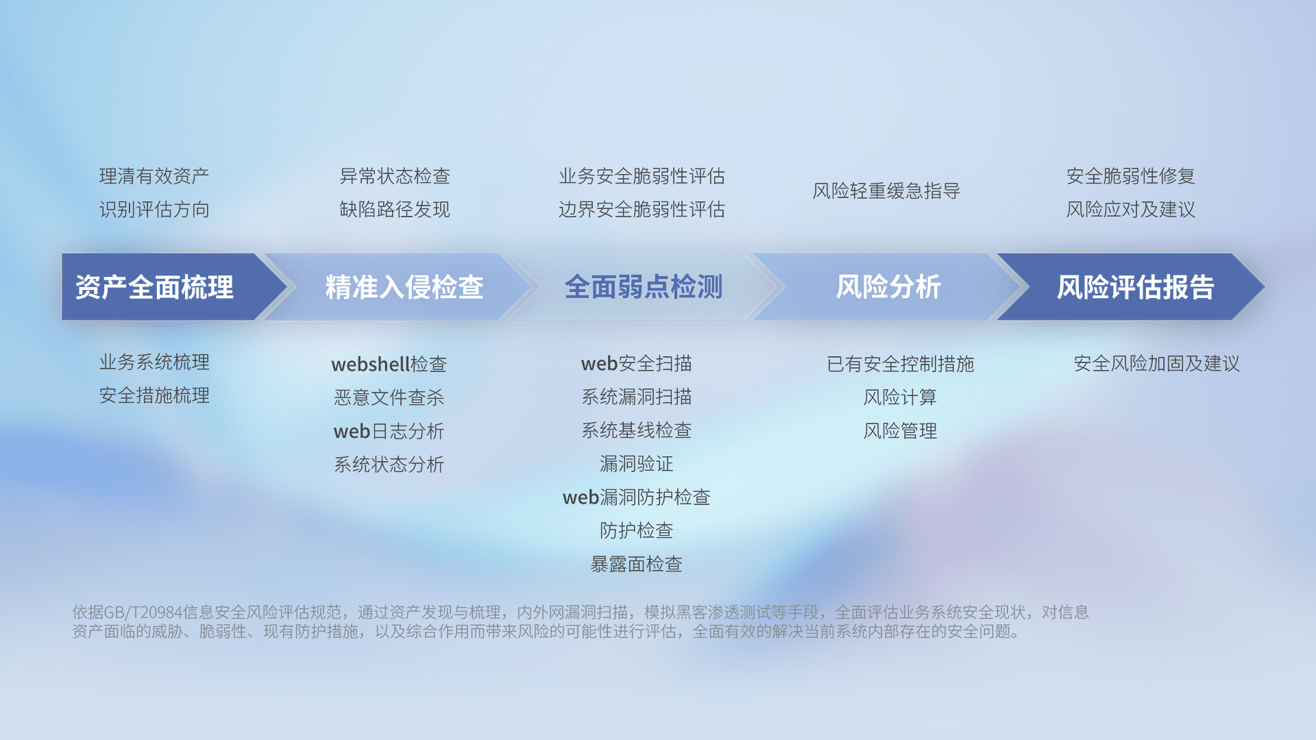 针对客户行业特性,,以专业的安全服务+多厂商联合解决方案提供专属的一站式安全管理服务,,,帮助客户全面感知网络空间威胁,,,,基于识别、、、检测、、、、分析、、防护、、、、监测、、、、响应的服务理论模型,,从方案咨询、、、集成交付、、、评估验证、、、、优化加固、、、运维运营,,,,致力于为客户提供完整的闭环管理式安全服务。。。。以实战经验为客户打造高抵御风险的安全体系,,,帮助客户发现威胁、、、对抗威胁、、、、处置威胁,,不断积累安全对抗能力,,,持续保障数字化安全。。